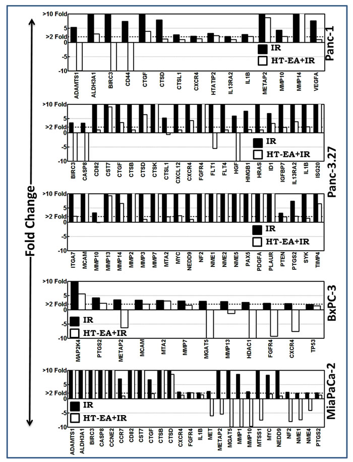 Figure 2: HT-EA alleviates RT-associated activation of tumor invasion and metastasis transcriptome in surviving PC cells. Histograms of QPCR profiling comparison analysis showing the HT-EA-associated regulation of fractionated radiation-induced tumor invasion and metastasis transcriptome in surviving Panc-1, Panc-3.27, BxPC-3, and MiaPaCa-2 cells.