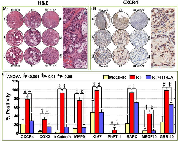 Figure 3: HT-EA mitigates RT-associated translation of tumor invasion and metastasis targets in residual PC. A. Representative microphotographs from hematoxylin & eosin stained PC tissue microarray (TMA) constructed with xenografts (established from MiaPaCa-2) exposed to mock-irradiation or fractionated irradiation, with or without HT-EA treatment. Pullout shows the staining pattern (20x magnification). B. Representative microphotographs from CXCR4-stained PC tissue microarray (TMA) constructed with xenografts exposed to mock-irradiation or fractionated irradiation, with or without HT-EA treatment. Pullout shows the staining pattern (20x magnification). C. Aperio TMA quantitation analysis showing protein-specific positivity magnitudes (mean + SD) in mock-irradiated PC xenografts, and residual PC after clinical RT, with or without HT-EA treatment. Group-wise comparisons were made using Two-way ANOVA with Bonferroni’s post-hoc correction.