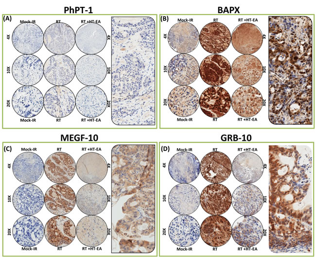 Figure 5: HT-EA mitigates RT-associated translation of PhPT-1, BAPX, MEGF-10, and GRB-10, in residual PC. Representative microphotographs from A. PhPT-1, B. BAPX, C. MEGF-10, and D. GRB-10-stained PC tissue microarray (TMA) constructed with xenografts (established from MiaPaCa-2) exposed to mock-irradiation or fractionated irradiation, with or without HT-EA treatment. The pullout in each panel represents the corresponding Ab staining pattern in 20x magnification, showing the protein-specific cellular localization. Please see Figure 3C for Aperio TMA quantitation analysis of PhPT-1-, BAPX, MEGF-10-, and GRB-10-specific positivity magnitudes (mean + SD) in mock-irradiated PC xenografts, and residual PC after clinical RT with or without HT-EA treatment.