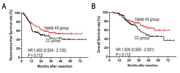 A total of 183 HCC patients who underwent hepatic resections were enrolled. Eighty-one (44.3%) patients were underwent resections with the HabibTM 4X (Habib group), and 102 (55.7%) patients underwent clamp-crush resection (CC group). Overall, there were 159 (86.9%) male and 23 (13.1%) female patients. The median age was 51.0 years (range: 22-79 years). During a median follow-up of 41.5 months (range: 4.0-79.5 months), 91 patients (49.7%) experienced recurrence, and 62 patients (33.9%) died. The 2- and 5-year OS rates were 76.9% and 52.3%, and the 2- and 5-year RFS rates were 55.4% and 43.7%, respectively.