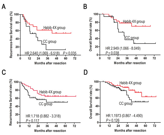 In addition, resections of central tumors [11] and large tumors [12] were always associated with more blood loss and poor survival. Thus, we further stratified patients according to tumor location and tumor size. Central tumors were defined as previous: tumor located central segments (Couinaud’s segments I, IV, V and VIII) and with a distance of ≥ 2 cm from the liver capsule. [11] For the 42 patients with central and large tumors (tumor size more than 5 cm), the Habib group had better RFS and OS (P = 0.035 and P = 0.038, respectively, Figures 4A and 4B). While, for the 92 patients with peripheral and small tumors (tumor size no more than 5 cm), two groups had similar RFS and OS (P = 0.117 and P = 0.126, respectively, Figure 4C and 4D).