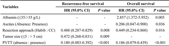 PVTT (hazard ratio [HR], 0.180; 95% confidence interval [CI] 0.083-0.392; P < 0.001), tumor size (HR, 0.472; 95% CI: 0.268-0.831; P = 0.009), and resection method (HR, 0.488; 95% CI: 0.287-0.829; P = 0.008) were independent predictive factors of RFS, after adjusting for propensity score. PVTT (HR, 0.186; 95% CI: 0.079-0.439; P < 0.001), albumin (HR, 2.857; 95% CI: 1.372-5.952; P = 0.005), resection method (HR, 0.449; 95% CI: 0.234-0.860; P = 0.016), and ascites (HR, 0.206; 95% CI: 0.047-0.900; P = 0.036) were independent prognostic factors for OS, after adjusting for propensity score.