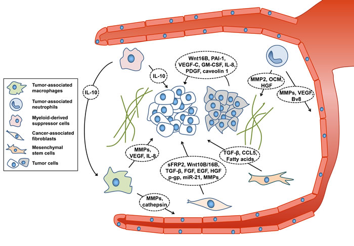 CAFs, cancer-associated fibroblasts; ECM, extracellular matrix; EMT, epithelial-to-mesenchymal transition; IDO, indoleamine-pyrrole 2,3-dioxygenase; GM-CSF, granulocyte-macrophage colony-stimulating factor; IL, interleukin; MDSCs, myeloid-derived suppressor cells; MDR1, multidrug resistance protein 1; MFG-E8; milk fat globule epidermal growth factor 8; MMP, matrix metalloproteinase; OSM, oncostatin M; PAI-1, plasminogen activator inhibitor-1; PGE2, prostaglandin E2; P-gp, P-glycoprotein; sFRP2, secreted frizzled-related sequence protein 2; TAMs, tumor-associated macrophage; TANs, tumor-associated neutrophil; VEGF, vascular endothelial growth factor.