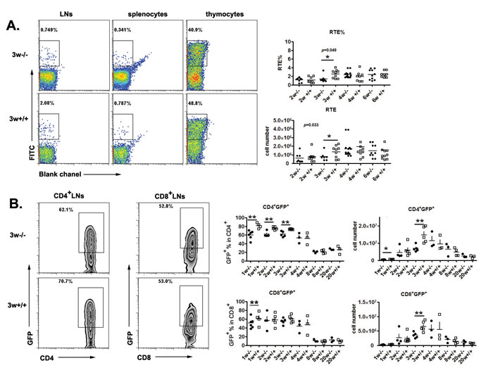 Figure 1: Thymic output decreased in neonatal Aire-/- mice. A. FITC was injected into the thymus of Aire-/- mice and littermates, twenty-four hours later, FITC+ cells in the thymus and periphery were collected to calculate the daily emigration rate(RTE%) and newly migrated cell number .Representative dot plots of FITC+ cells from 3-week old mice are shown on the left and the ratio and cell numbers of RTEs on the right. 8-10 pairs of littermates were used for each time point. B. The Aire-/-RAG-GFP mice were used to detect the recent thymic emigrants during mouse ontogeny. Representative zebra plots of GFP+ cells in the lymph nodes from 3-week old mice are shown on the left The ratio and absolute number of GFP+ cells in CD4+ and CD8+ T cells from lymph nodes were shown on the right. 3-5 pairs of littermates were detected for each time point. * p < 0.05, ** p < 0.01.