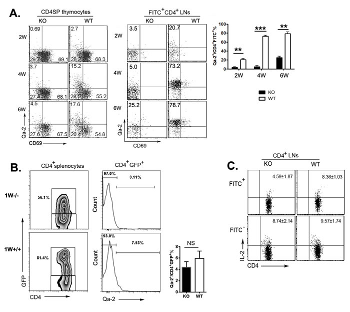 Figure 2: Phenotype alterations of TCRβ+CD4SP thymocytes and RTEs. A. CD8-depleted thymocytes from various time points during Aire-/- mice and littermates ontogeny were stained anti-CD4, anti-TCR-β, anti-CD69 and anti-Qa-2. The expression of CD69 versus Qa-2 was analyzed in TCRβ+CD4SP medullary thymocytes(left). Twenty-four hours after FITC injection, CD4+FITC+ cells in lymph nodes were collected for Qa-2 and CD69 analysis (middle).The ratio of Qa-2 expression on RTEs was shown on the right panel. Data from 5 mice are shown as mean± SD. B. Representative zebra plots of GFP expression on CD4+ splenocytes from 1-week old Aire-/- RAG-GFP mice and littermates was shown on the left panel. Qa-2 expression on CD4+GFP+RTEs were shown in the middle. The ratio Qa-2+ in CD4+ GFP+ cells were summarized on the right panel. Data from 5 mice are shown as mean ± SD.C. 3-week old Aire-/- mice and littermates were intrathymic injected FITC. Twenty-four hours later, CD4+ cells in lymph nodes were collected and stimulated with PMA and ionomycin for 4 hours. After intracellular staining of IL-2, CD4+FITC+ and CD4+FITC- cells were gated for IL-2 analysis. Data from 5 mice are shown as mean±SD. ** p < 0.01, *** p < 0.001. NS, no significance.