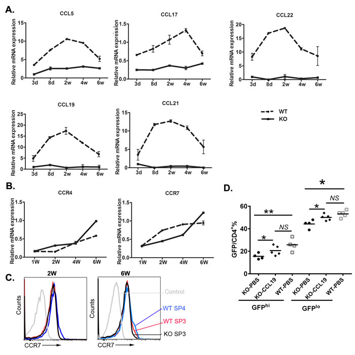 Figure 4: The chemokines and receptors expression in the thymus during mouse ontogeny. A. The mRNA expression level of the CCR4 ligands CCL5, CCL17, and CCL22 and the CCR7 ligands CCL19 and CCL21 in whole thymi from Aire-/- mice and littermates were analyzed by qPCR. K-8 was used as internal standard. B. The mRNA expression of CCR4 and CCR7 in whole thymi. GAPDH was used as internal standard. The experiment was repeated for 4 times and a representative result is shown. C.The cell surface CCR7 expression in SP3 and SP4 thymocytes from 2- or 6-week old Aire-/- and littermate were shown in overlay histograms. D. 1μg CCL19 or PBS was intrathymically injected to the 2 weeks old Aire-/- RAG2p-GFP mice,littermate Aire+/+ RAG2p-GFP mice were administrated with PBS. 3 days later, CD4+ T cells were collected from the lymph nodes, and GFP fluorescence intensity was used to determine GFPhi and GFPlo RTEs cells. NS, no significance. * p < 0.05, ** p < 0.01.