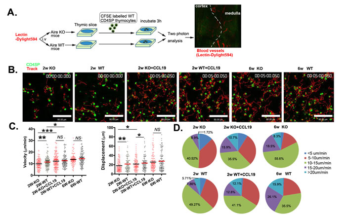 Figure 5: The reduced motility of CD4SP thymocytes within the thymic tissue of neonatal Aire KO mice. A. The experimental design used to analyse CD4SP thymocyte migration in sliced thymic tissues using a two-photon microscope. Dylight594 conjugated lectin was injected to the Aire-/- and Aire+/+ mice just prior to sacrifice. 4×105 CFSE-labelled CD4SP cells were loaded onto thymic slices from Aire-/- or Aire+/+ mice, and the cells on the slice were incubated for 3h at 37°C/5% CO2 to allow cells to enter the tissue. For CCL19 rescue assay, CD4SP cells were incubated with 200ng/ml CCL19 and then loaded on the thymic tissues. The slice was imaged by two photon microscope. The thymic structures were visualized by the labelled blood vessels. B. The movements of individual cells were tracked. CD4SP (green). Tracks (red). Scale bar, 80 μm. C. The average velocity of CD4SP in the medulla are shown in left panel. Bars indicate the median. Average displacements from the origin plotted are also shown in right panel. The raw tracking data for CD4SP thymocytes are from three independent experiments. (2 weeks-old Aire-/-, n = 116 , Aire+/+ mice, n = 140; 2 weeks-old with CCL19 Aire-/- , n = 168 and Aire+/+ mice,n = 140 , 6 weeks-old Aire-/-,n = 108 and Aire+/+ mice, n = 138 ). D. Profiles of the migration velocities of CD4SP cells on different thymic slices. p values were calculated by Mann-Whitney U-test, * p < 0.05, ** p < 0.01, *** p < 0.001. NS, no significance.