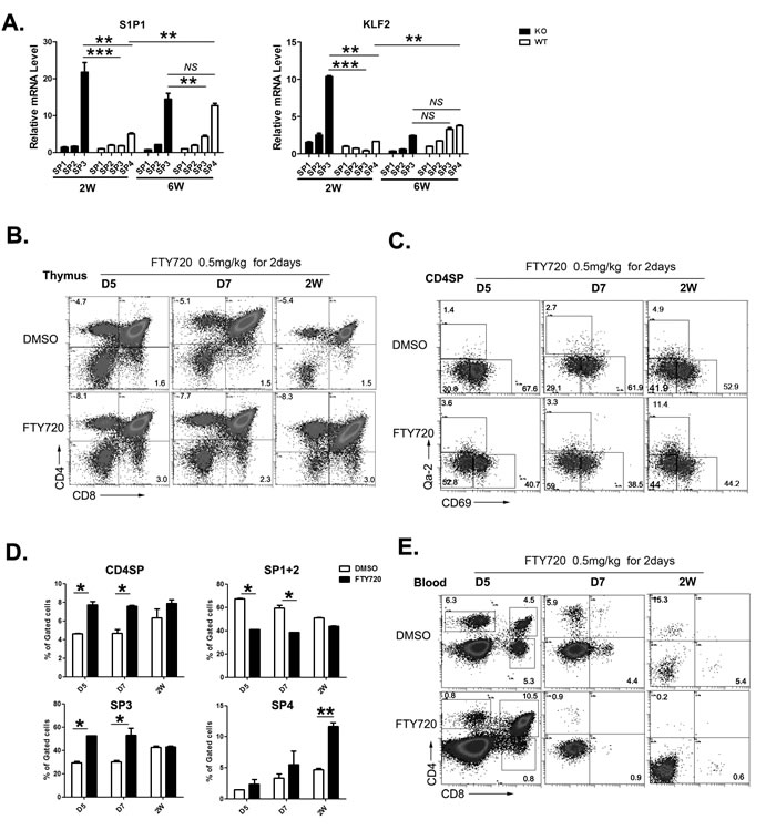 Figure 6: The role of S1P1 signal in neonatal thymic output. A. The four subgroups of CD4SP thymocytes from 2 and 6-week old Aire-/- mice and littermates were sorted. The mRNA expression levels of S1P1 and KLF2 were analyzed by qPCR. GAPDH was used as internal standard. B.-E. FTY720 (0.5mg/kg) was administrated to wild type mice from D5 to 2 weeks old by intraperitoneally injection for 2 days. B.-D. 24 hours later, thymocytes were collected for CD4,CD8,CD69 and Qa-2 staining. The ratio of CD4SP in total thymocytes and SP1 to SP4 cells in CD4SP were indicated as mean± SD. * p < 0.05. ** p < 0.01. E. Blood depleted red cells was collected for CD4 and CD8 staining. Representative dot plots were shown. N = 5. * p < 0.05, ** p < 0.01, *** p < 0.001. NS, no significance.