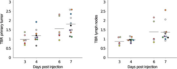 Figure 2: The tumor-to-background ratio (TBR) of 89Zr-cetuximab in the primary tumor (left) and maximum TBR in the lymph nodes (right) plotted as a function of the number of days between 89Zr-cetuximab administration and PET/CT imaging. The bars depict the mean uptake for the individual scan points. Each patient is depicted with a different color. Two patients (white marks) were only scanned on one day.