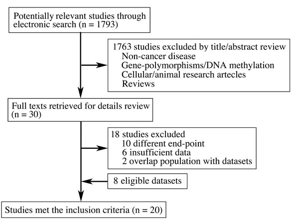 A total of 1793 literatures were identified from electronic search. Full texts of thirty publications were retrieved after reviewing titles and abstracts. After exclusion of 18 literatures (Table S1), finally, twelve studies [16-27] and eight datasets (GSE3149, GSE9891, GSE26712, GSE30161, GSE14764, GSE26193, GSE14814 and TCGA) [28-35] with 2149 cases met the inclusion criteria (Figure 2 and Table 1).