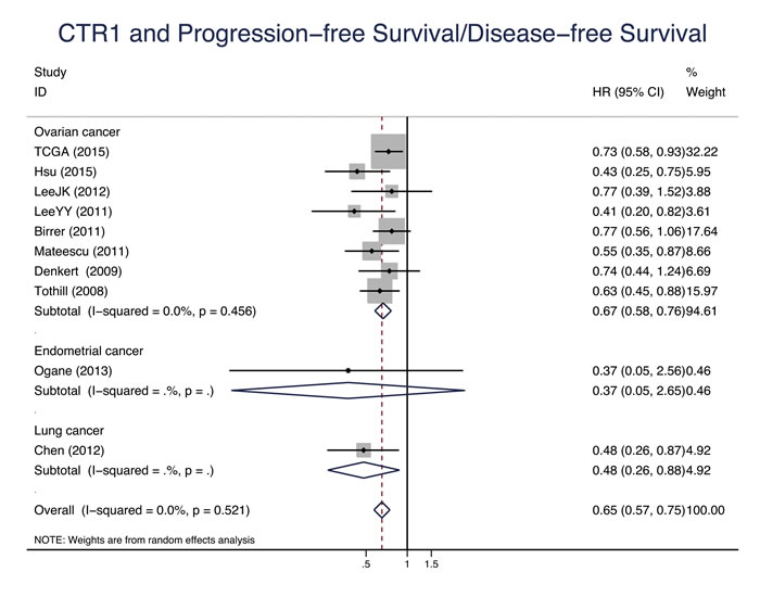 Figure 4: CTR1 and progression-free survival/disease-free survival. Forest plot presents summary hazard ratios (HRs) and 95% confidence intervals (CIs) of correlation between CTR1 expression and progression free survival/disease-free survival (PFS/DFS in epithelial cancers.
