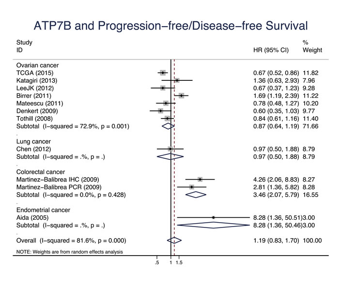Figure 10: ATP7B and progression-free survival/disease-free survival. Forest plot presents summary hazard ratios (HRs) and 95% confidence intervals (CIs) of correlation between ATP7B expression and progression free survival/disease-free survival (PFS/DFS in epithelial cancers.