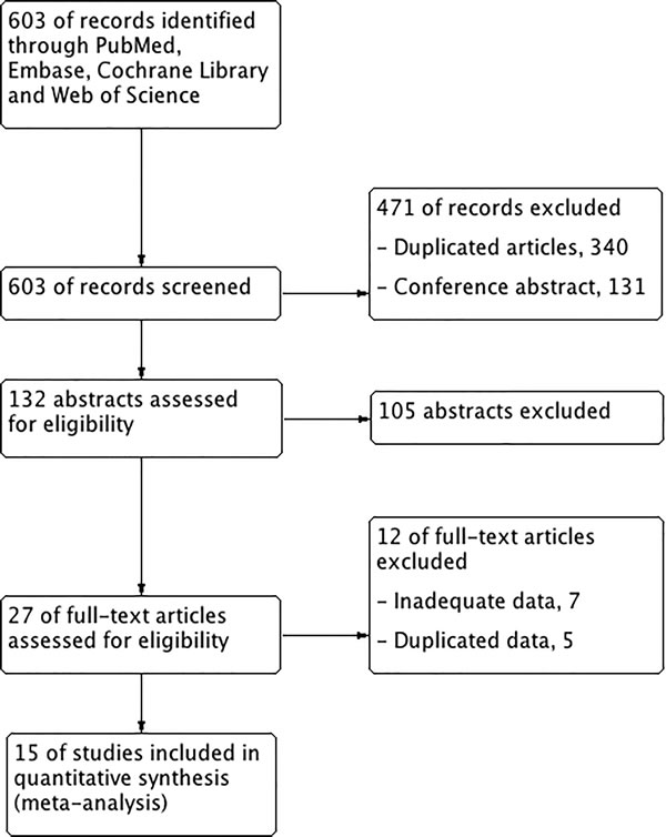 For primary retrieval, 603 articles were identified through 4 databases. The results were as follows: 336 articles from Embase, 169 articles from Web of Science, 98 articles in PubMed, and none from Cochrane Library. We firstly excluded the duplicates (n = 340) and conference abstracts (n = 131). Of the remaining, 105 articles were excluded according to the titles and abstracts, we included 27 potentially eligible articles from all databases and reviewed the full text. Of these articles, 7 were eliminated because the ln(hazard radio (HR)) and its variance of 18F-FDG-PET/CT parameters from NPC patients could not be extracted and calculated [20-25]; 4 were excluded because two author published 4 and 2 reports on the same population, respectively [26-28], [29]; and 1 article of overlapping patients was also excluded [18]. Finally, 1,938 patients of 15 studies published from 2008-2016 were eligible for this study (Figure 1) [17, 19, 30-42].