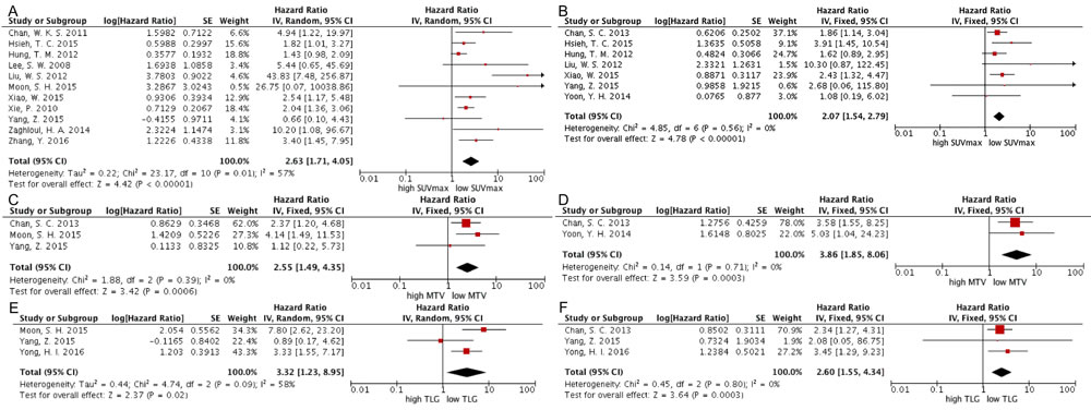 Two authors (J Lin and H Li) performed the data extraction independently from the publications. A Microsoft Excel sheet was designed to collect the following items: (1) Basic information of study including author names, year of publication, study period, follow-up duration, study design; (2) Details of patient and tumor including patient source, number, median age, TNM staging and end points provided; (3) Data of 18F-FDG-PET scan and parameters including PET scanners, duration of fasting before FDG injection, pre-injection blood glucose test, radiation doses of FDG, post-injection interval, the method of determination of cut-off values, PET parameters, tumor delineation and cut-off values of SUVmax, MTV, TLG.