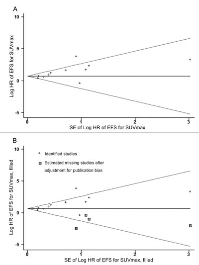 In this meta-analysis, disease-free survival, progression-free survival, disease metastasis-free survival in the included studies were merged and redefined as EFS. The primary endpoint was EFS, defined as the time from initiation of therapy until recurrence or metastasis [43]. The secondary outcome was OS, which was measured from the date of initiation of therapy to the date of death from any cause. The impact of 18F-FDG PET parameters on survival outcomes was measured by the effective size of the HR. HR values of included study were extracted using the following methodology suggested by Parmar et al. [81] and Tierney et al. . [82] HR values and its 95% CIs from included studies could be directly extracted if the original data was supplied by the authors. Otherwise, P values of the log-rank test, number of events, and total number of patients in each group were extracted to estimate the HR indirectly; or, we extracted the HRs from survival curves. We presumed that patients were censored at a constant rate during the follow-up, and the Kaplan-Meier curves were read by Engauge Digitizer (version 8.2 for Mac; http://digitizer. sourceforge.net) to reconstruct the HR estimate and its variance. An observed HR>1 indicated a worse prognosis in patients with high parameter value and HR < 1 suggested a better prognosis. Heterogeneity between studies was evaluated by Chi-square test and I2 statistics, following recommendation of Cochrane Handbook (http://handbook.cochrane.org/). If P-value was >0.1 or/and I2 < 50%, indicating there was no or moderate heterogeneity, a fixed-effects model was used; otherwise, the random-effects model was used. The analyses described above were conducted by Review Manager (RevMan, version 5.3; The Nordic Cochrane Centre, The Cochrane Collaboration). Begg’s funnel test and Egger’s test were made for testing publication bias by STATA version 12.0 (STATA Corp., College Station, TX). It is considered statistically significant when a P-value is less than 0.05.