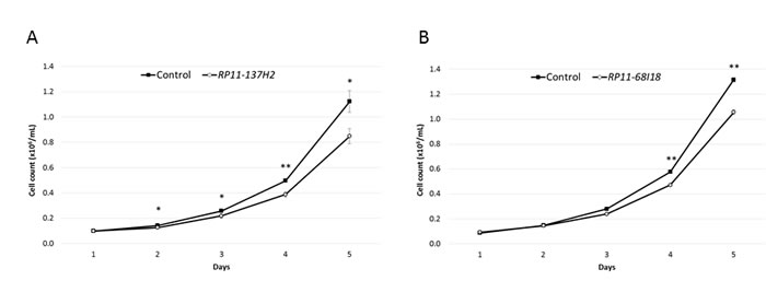 Figure 1: Silencing of lncRNAs upregulated in cALL reduces cell proliferation. A. Reduction of cell proliferation in NALM-6 cells transfected with dsiRNA against RP11-137H2.4, measured by counting cells in triplicate each day for 5 days. B. Reduction of cell proliferation in NALM-6 cells transfected with siRNA against RP11-68I18.10, measured as in (A). Control cells were transfected with negative control siRNA/dsiRNA (see Methods). Comparisons were made using a two-tailed T-test. *: P ≤ 0.05; **: P ≤ 0.01.