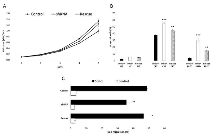 Figure 3: RP11-137H2.4 silencing restores normal glucocorticoid apoptotic response. A. Reduction of cell proliferation in Reh cells stably transduced with shRNAs against RP11-137H2.4 (“shRNA”) and partial rescue of the phenotype by overexpressing the lncRNA in a cell line where RP11-137H2.4 is silenced (“Rescue”, see Methods), measured by counting cells in triplicate each day for 5 days. B. Increased apoptosis with camptothecin or prednisolone treatment and partial rescue of the phenotype by overexpressing the lncRNA measured by AnnexinV / propidium iodide staining. Reh cells stably transduced with shRNAs against RP11-137H2.4 were treated with 10 µM camptothecin for 6 hours or 750 µM prednisolone for 24 hours. DMSO was used as vehicle control for prednisolone. C. Reduction of cell migration in Reh cells stably transduced with shRNAs against RP11-137H2.4 and partial rescue of the phenotype by overexpressing the lncRNA, measured by counting cells in triplicate, using SDF-1 as a chemoattractant. Control cells were stably transduced with scrambled shRNA. Comparisons were made using a two-tailed T-test. *: P ≤ 0.05; **: P ≤ 0.01; ***: P ≤ 0.001.