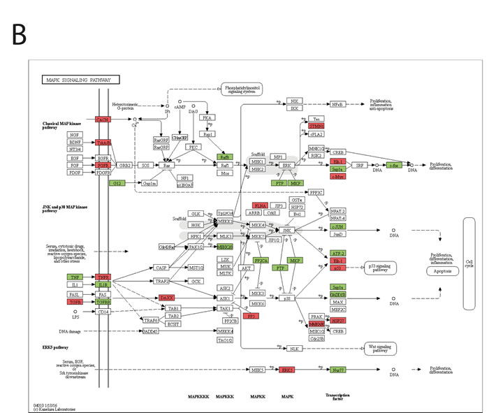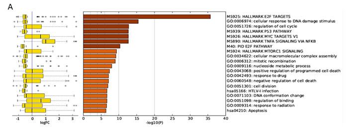 Figure 4: Gene ontology (GO) analysis of RP11-137H2 silencing-specific gene expression deregulation upon prednisolone exposure. Whole-transcriptome deep sequencing was performed on Reh cell lines expressing either scrambled or RP11-137H2.4-specific shRNA. Cells were exposed for 24 h to either vehicle (DMSO) or 750 µM prednisolone. A. Deregulated genes’ enriched GO categories are reported with significance (-log10(P)) (right) along with a box-plot of log2 expression fold changes for the corresponding GO categories (left). Edges of the box are the first and third quartiles, while the band inside the box is the median. Whiskers represent minimum and maximum values. B. Genes in the MAPK cascade deregulated in Reh cells following RP11-137H2.4 silencing and prednisolone treatment (red is downregulated, green is upregulated). C. Genes in the cell cycle pathway deregulated in Reh cells following RP11-137H2.4 silencing and prednisolone treatment (red is downregulated, green is upregulated).