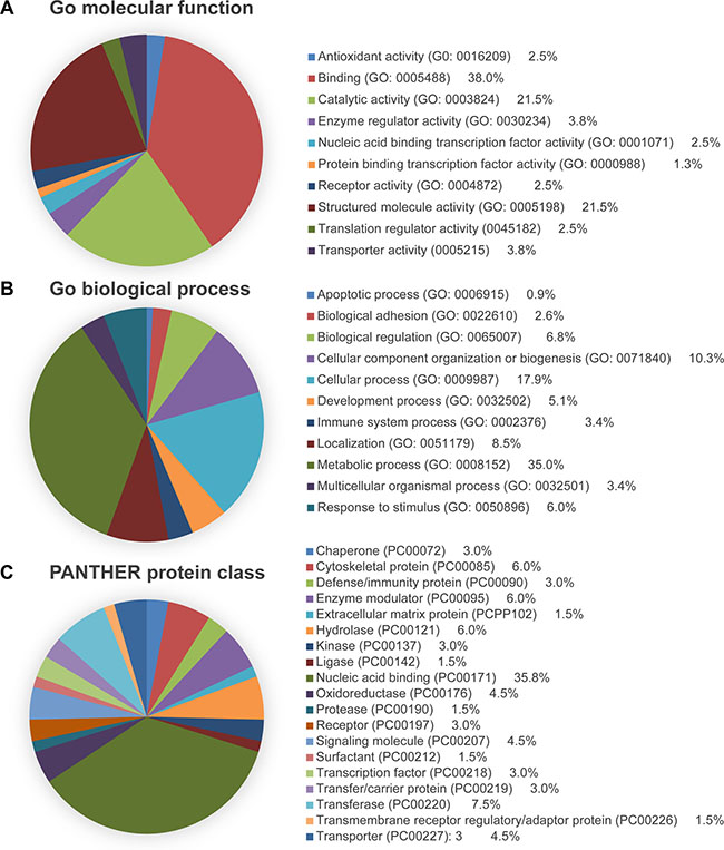 Figure 2: PANTHER analysis of the DEPs identified through iTRAQ proteomics. Proteins were categorized by (A) molecular function, (B) biological process, and (C) protein class.