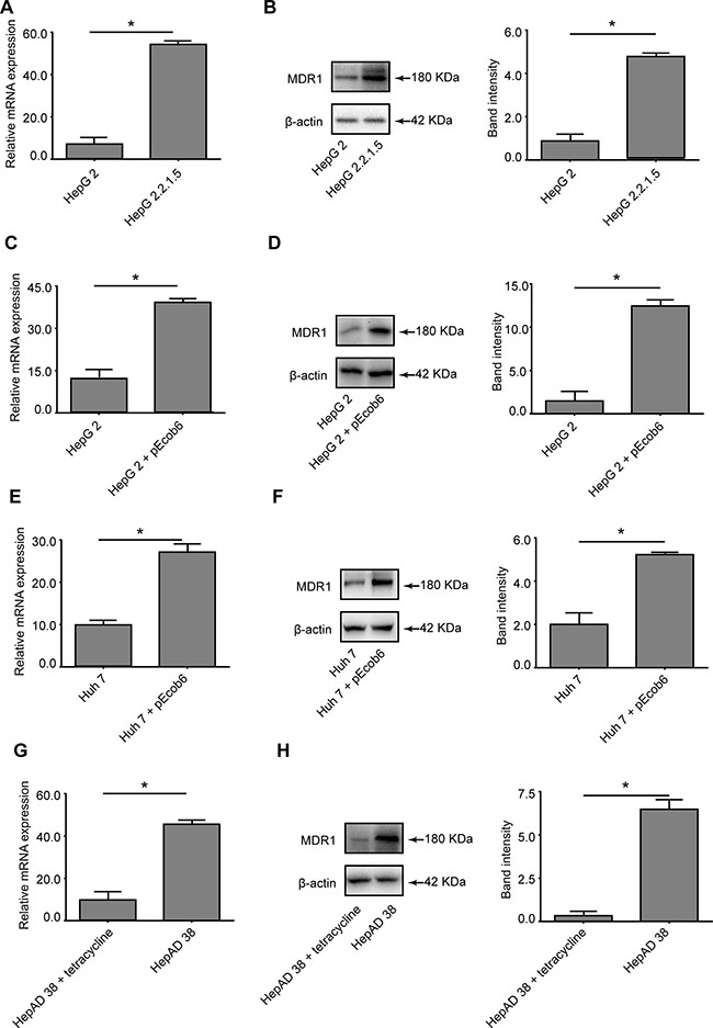 To seek an additional indication for a possible link between MDR1 expression and HBV infection, MDR1 expression in several cell lines with or without HBV expression were analyzed by RT-qPCR and western blot. Figure 4A and 4B show that MDR1 expression was significantly elevated in HepG2.2.1.5 cells at both the mRNA and protein levels, compared to HepG2 cells. Parallel results were observed in HepG2 (Figure 4C and 4D) and Huh 7 (Figure 4E and 4F) cells, after transfecting with pEcob6 (1.0 μg) plasmid, which contained two copies of HBV DNA sequences in tandem. The mRNA and protein levels of MDR1 in HepAD 38 cells (Figure 4G and 4H), when the secretion of HBV was not blocked (cultured without tetracycline), were higher than when the secretion of HBV was blocked (with tetracycline) [11] (all P < 0.05).