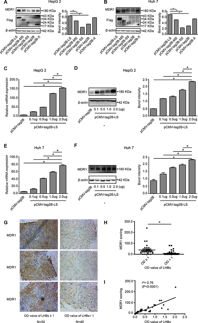 Figure 5: Evaluation of the relationship of LHBs and MDR1 in cells and liver tissues of CHB patients. (A) Western blot analysis of MDR1 expression in pCMV-tag2B-LS, pCMV-tag2B-MS, pCMV-tag2B-SS, pCMV-tag2B-SS, or pCMV-tag2B plasmid-transfected HepG2 cells. (B) Western blot analysis of MDR1 expression in pCMV-tag2B-LS, pCMV-tag2B-MS, pCMV-tag2B-SS, pCMV-tag2B-SS, or pCMV-tag2B plasmid-transfected Huh7 cells. (C) RT-qPCR detection of the mRNA levels of MDR1 induced by different pCMV-tag2B-LS plasmid concentrations (0.1–2.0 μg) in HepG2 cells. (D) Western blot analysis of MDR1 expression induced by different pCMV-tag2B-LS plasmid concentrations (0.1–2.0 μg) in HepG2 cells. (E) RT-qPCR detection of the mRNA levels of MDR1 induced by different pCMV-tag2B-LS plasmid concentrations (0.1–2.0 μg) in Huh7 cells. (F) Western blot analysis of MDR1 expression induced by different pCMV-tag2B-LS plasmid concentrations (0.1–2.0 μg) in Huh7 cells. (G) Representative IHC images with hematoxylin counterstaining (400× magnification): the immmunohistochemical analysis of MDR1 expression in liver sections of 70 patients with CHB. (H) Corresponding scores of MDR1 from different LHBs level samples. (I) Linear regression of LHBs and MDR1 in IHC. (Bars indicate SD, *P < 0.05.)