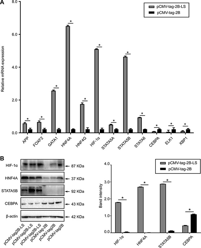Figure 7: Evaluation of the differentially expressed transcription factors in HepG2 cells transfected with pCMV-tag2B-LS or pCMV-tag2B plasmid. (A) RT-qPCR detection of the relative mRNA expression levels of APP, CEBPA, ELK1, FOXF2, GATA1, HNF4A, HNF4G, HIF-1α, STAT5A, STAT5B, STAT6, and XBP1, normalized to GADPH. (B) A representative western blot analysis of HNF4A, HIF-1α, STAT5B, and CEBPA expression levels in HepG2 cells transfected with the pCMV-tag2B-LS or pCMV-tag2B plasmid. (Bars indicate SD, significant as compared to the control, *P < 0.05.)