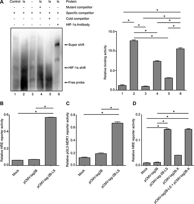 HIF-1α was significantly elevated at both the mRNA (Figure 7A) and protein levels (Figure 7B) in the pCMV-tag2B-LS-transfected cells, suggesting that LHBs induced a high expression level of HIF-1α. To further confirm the effect of LHBs on HIF-1α activation, we performed an EMSA. As shown in Figure 8A, HIF-1α exhibited ten-fold higher activity in the LHBs-overexpressing cells than in the controls. These changes were in line with the array analysis results. Next, a coreporter gene assay by cotransfecing HepG2 cells with pCMV-tag2B-LS plasmid and the HRE reporter (HRE-Luc)/pGL3-MDR1 plasmid were carried out. Activation of the HRE and pGL3-MDR1 reporter activity were detected in LHBs-overexpressing cells (Figure 8B and 8C), which indicating that HIF-1α upregulation mediated by LHBs was a critical factor for MDR1 gene overexpression. Then, HepG2 cells were transfected with pCMV-tag2B-LS and pCMV-tag2B-X plasmid separately or mixed to explore the relationship between the overexpression and the induction of MDR1. Figure 8D shows that the HRE activity was 14-fold and 4-fold higher in LHBs- and X protein-overexpressed cells, respectively. Similarly, the HRE activity was elevated by 14-fold when the cells were cotransfected with the two plasmids.