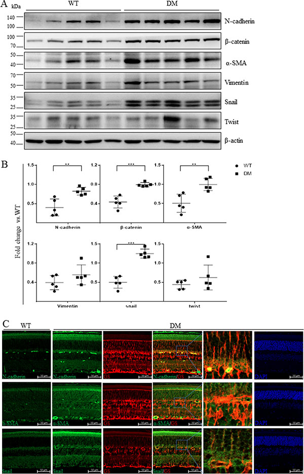 Figure 2: Mesenchymal marker expression was increased in the retinas of STZ-diabetic mice. (A) The expression of mesenchymal markers in non-diabetic mice and mice with STZ-induced diabetes was measured using Western blots (n = 5). Each lane represents an individual animal. (B) Quantification of the bands from WT and DM mice in Figure 2A (**p < 0.01, *p < 0.05, n = 5). β-actin served as a loading control. (C) Representative retinal images showing increases in the colocalization of N-cadherin, α-SMA, and Snail (green) with the Müller cell marker GS (red) in STZ-diabetic mice compared to control mice; scale bar: 50 μm.
