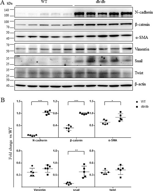 Figure 3: Mesenchymal marker expression was increased in the retinas of db/db mice. (A) The expression of mesenchymal markers in 16-week-old wild-type mice and db/db mice was examined using Western blots (n = 5). Each lane represents an individual animal. (B) Quantification of the bands from WT and db/db mice in Figure 3A (**p < 0.01, *p < 0.05, n = 5). β-actin served as a loading control.