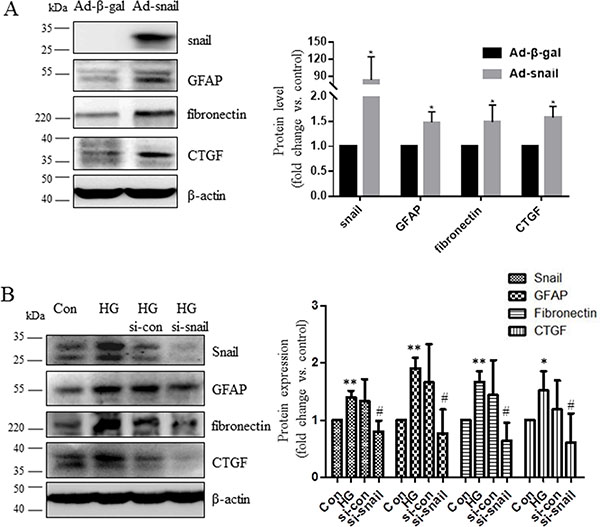 Figure 6: Snail increased CTGF and fibronectin expression in Müller cells. (A) Müller cells were infected with adenovirus expressing Snail (Ad-Snail) or control adenovirus expressing β-galactosidase (Ad-β-gal) with an MOI of 20 for 48 hours. (B) Müller cells were transfected with control siRNA or Snail-siRNA for 24 hours then incubated in high glucose conditions for additional 48 hours. Total cellular proteins were immunoblotted with antibodies for GFAP, fibronectin, and CTGF. Blots are representative of three independent experiments. The bands were quantified relative to β-actin (mean ± s.d., **p < 0.01, *p < 0.05, n = 3).