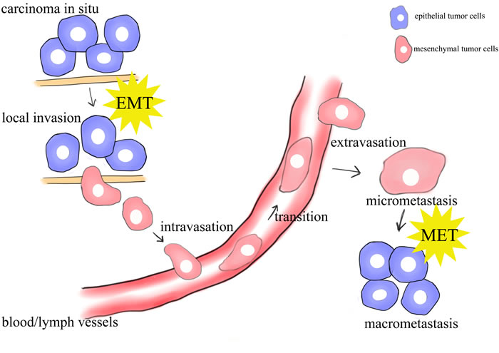 Figure 1: schematic mode of the sites of EMT/MET in the metastasis of cancer. Epithelial cells undergo epigenetic changes and genetic alterations to become carcinoma in situ. Further alterations can induce local invasion of tumor cells, possibly through an EMT. The cells can intravasate into nearby blood and lymphatic vessels, be transported through the systems, and extravasate into the parenchyma of distant tissues. These cells may either be solitary or form a secondary tumor through a MET.