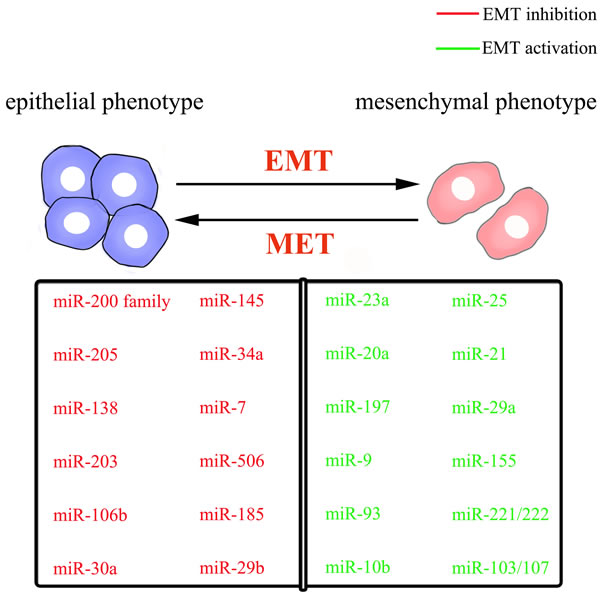 32. Bullock MD, Sayan AE, Packham GK, and Mirnezami AH. MicroRNAs: critical regulators of epithelial to mesenchymal (EMT) and mesenchymal to epithelial transition (MET) in cancer progression. Biol Cell. 2012; 104: 3-12.