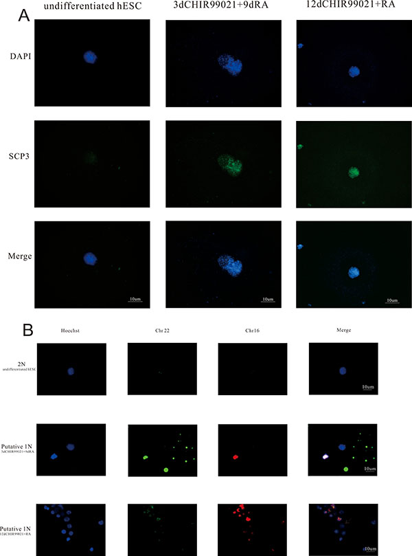 Figure 3: Putative haploid cells were formed in this induced process. (A) Immunofluorescence staining with SCP3 is shown. Scale bars, 10 μm. (B) FISH with probe against autosomal chromosome 16 and chromosome 22 in the undifferentiated hESCs group and two induced groups. Scale bars, 10 μm.