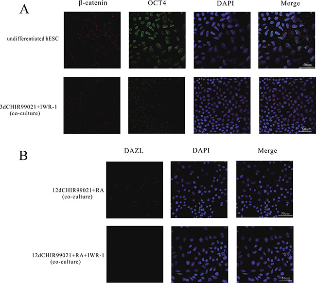 Figure 5: IWR-1 inhibited the accumulation of β-catenin in the nuclei and decreased the number of DAZL positive cells. (A) Immunofluorescence straining of β-catenin and OCT4 in 3 d CHIR99021 plus IWR-1 co-culture group and undifferentiated group. Scale bars, 50 μm. (B) Immunofluorescence straining of DAZL in 12 d CHIR99021, IWR-1 and RA co-culture group and undifferentiated group. Scale bars, 50 μm.