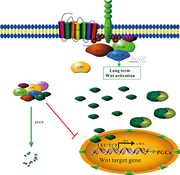 To further explore the contribution of CHIR99021 to differentiation, we chose a small-molecule inhibitor of the Wnt signaling pathway, IWR-1. It induces Axin2 protein levels and promotes β-catenin phosphorylation by stabilizing Axin-scaffolded destruction complexes. After blockade the Wnt signaling pathway, we can not observe that the translocation of β-catenin into nucleus and the expression of DAZL protein in the optimum induced protocol. Thus, we recognized that the 3 d CHIR99021 following 9 d RA may work as follows: the activated Wnt signaling pathway by CHIR99021 firstly causes the translocation of β-catenin into the nucleus; then, RA induces the emergence of PGCs by the up-regulation of c-Kit. Moreover, the co-culture with CHIR99021 and RA may explain that the Wnt signaling pathway was constitutively activated by CHIR99021 even past the first 3 d (during the remaining 9 d), and RA acts in the same function as described above (Figure 6). In the future, it would be very interesting to test how to induce mature sperm cells and to improve the efficiency of induced sperm cells.