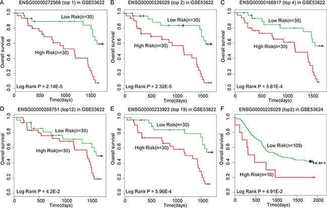 Univariate Cox regression analysis was used to identify lncRNAs that significantly impacted patient survival (P < 0.05). The Kaplan-Meier survival analysis was performed for the two groups of patients and statistical significance was assessed using the log-rank test (P < 0.05). All analyses were performed based on R 3.2.2 framework.