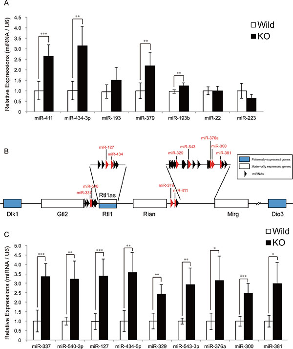 We previously identified 11 miRNAs which were upregulated or downregulated in myostatin knockout mice by microarray analysis, and validated the expression of miR-486 and miR-206 [12]. However, the expression of the remaining 9 miRNAs (miR-411, miR-434-3p, miR-299*, miR-193, miR-146b, miR-379, miR-193b, miR-22, and miR-223) has not been verified. To reveal the role of these miRNAs in the muscular phenotype of myostatin knockout mice, we quantified their expression by qRT-PCR, and observed a significant increase in the expression of miR-411, miR-434-3p, miR-379, and miR-193b in myostatin knockout mice (Figure 1A). Among these, the increased expressions of miR-411, miR-434-3p, and miR-379 were of interest because these miRNAs are expressed from the mouse chromosome 12qF1 (chr12qF1), called as the Dlk1-Dio3 locus (Figure 1B). The Dlk1-Dio3 locus is highly conserved in mammals and contains both paternally and maternally expressed genes [13]. In addition, the miRNA cluster (more than 100 miRNAs) is maternally transcribed from the Dlk1-Dio3 locus [14]. We randomly picked 9 miRNAs (miR-337, miR-540-3p, miR-127, miR-434-5p, miR-329, miR-543-3p, miR-376a, miR-300, and miR-381) expressed from the Dlk1-Dio3 locus and validated their expression by qRT-PCR. The results of this quantification showed that the expression of all miRNAs tested was significantly increased in myostatin knockout mice (Figure 1C). These results indicate that myostatin deficiency increases the expression of the miRNA cluster located in the Dlk1-Dio3 locus in the skeletal muscle.