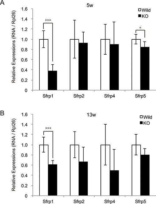 Figure 3: Decreased expression of SFRP family genes in myostatin-deficient skeletal muscle. Quantification of expression levels of SFRP (Secreted frizzled-related protein) genes, which are secreted inhibitors of Wnt signaling pathway, was performed by qRT-PCR. A significant decrease in the expression of Sfrp1 was observed in myostatin-deficient skeletal muscle at 5 (A) and 13 (B) weeks of age. In addition, a significant decrease in Sfrp5 expression was also detected in myostatin knockout mice at 5 weeks of age (A). The wild-type mice are the same age as the myostatin knockout mice. The results were normalized to the expression of Rpl26. Data are mean ± SD (n = 5). *P < 0.05, ***P < 0.001.