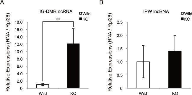 Figure 7: Increased expression of IG-DMR ncRNA in myostatin-deficient skeletal muscle. (A) Quantitative RT-PCR analysis shows the increased expression of IG-DMR ncRNA in myostatin-deficient skeletal muscle at 13 weeks of age. (B) Myostatin deficiency does not affect the expression level of IPW lncRNA. The wild-type mice are the same age as the myostatin knockout mice. The results were normalized to the expression of Rpl26. Data are the mean ± SD (n = 5). **P < 0.01.