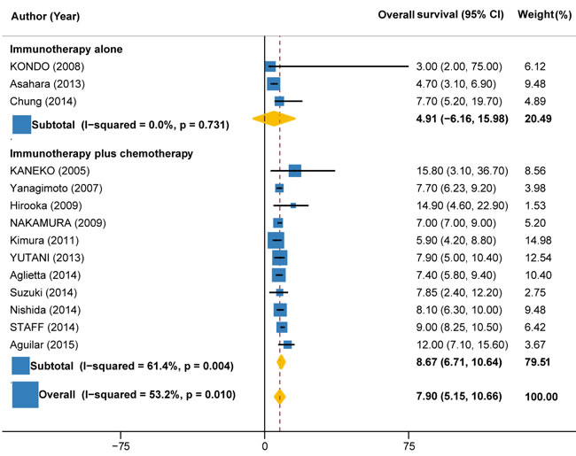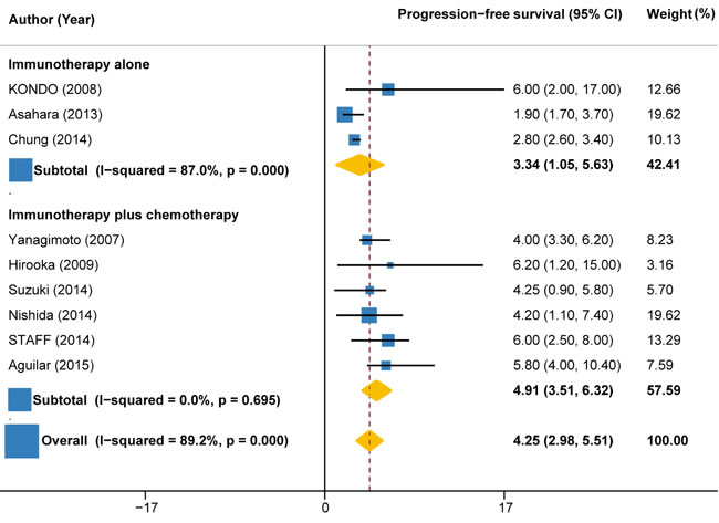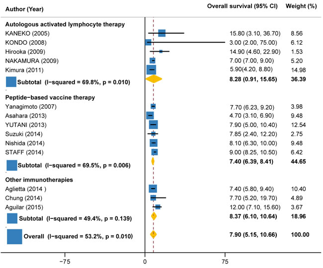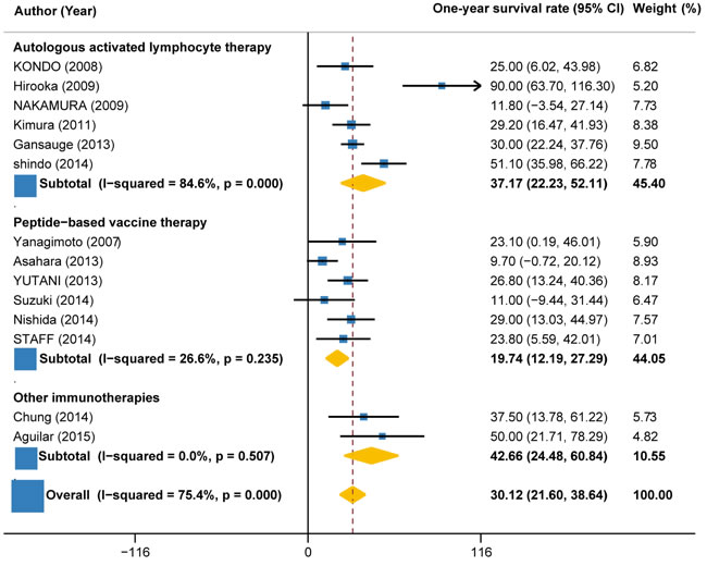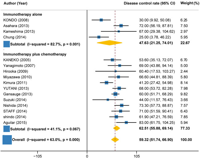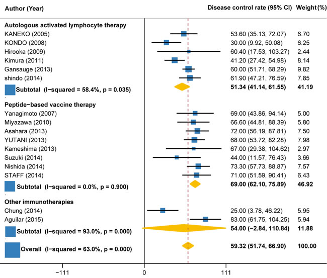 Data on disease control rate (DCR) (partial response [PR] + complete response [CR] + stable disease [SD]), overall survival (OS), progression-free survival (PFS), 1-year survival rate and treatment-related adverse events (TRAEs) were independently extracted by two reviewer, with any discrepancies resolved by consensus (and if necessary with a third reviewer). The primary endpoint evaluated was DCR. The secondary endpoints evaluated were OS, PFS, 1-year survival rate and TRAEs. OS and PFS were estimated from the date of the initial treatment to the date of death or final follow-up and the date of disease progression, respectively. These endpoints were analyzed for all included studies for which data were available. The subgroup analyses were conducted according to the type of immunotherapy (autologous activated lymphocyte therapies, peptide vaccine therapy, and other immunotherapies such as monoclonal antibodies), combination with or without chemotherapy.