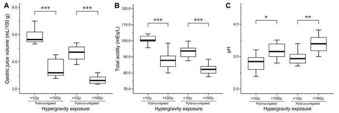 Figure 1: Effects of hypergravity exposure on gastric juice parameters. Box-and-whisker diagram. The band inside each box indicates the median value of each group. Acute exposure to hypergravity (+10Gz) significantly decreases A. gastric juice volume and B. total acidity and increases C. gastric juice pH. One-way ANOVA was used to compare means of samples among groups. ***P < 0.001.