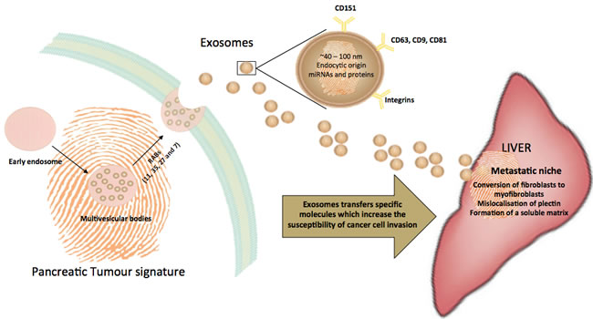 Figure 1: Trafficking of exosomes to the liver, a common site of metastasis for pancreatic cancers. Exosomes are derived from the endocytic pathway and are released by exocytosis. Thus, exosomes encapsulate a unique, cell-specific ‘signature’ of the cellular environment. In cancer, exosomes facilitate the development of a metastatic niche by compromising the cellular matrix of the target tissue and making it more susceptible to invasion by tumour cells.