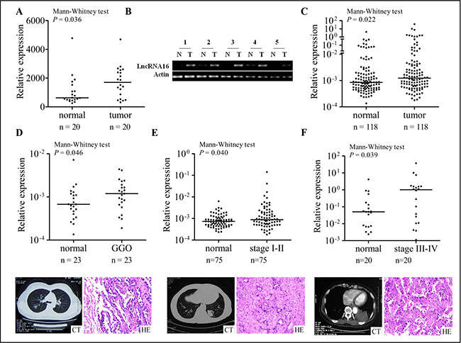 Figure 1: Increased tissue levels of lncRNA16 in lung cancer tissue samples. (A) Relative expression of lncRNA16 in 20 lung cancer tissues and adjacent matched normal tissues was analyzed using an lncRNA microarray. (B) LncRNA16 expression in five lung cancer tissues and adjacent matched normal tissues was measured by RT-PCR. T, tumor tissues; N, adjacent matched normal tissues. (C) Relative lncRNA16 expression in 118 lung cancer tissues and adjacent matched normal tissues was determined by qRT-PCR. (D) Relative lncRNA16 expression in 23 GGO and adjacent matched normal tissues. The classic characters of radiology and pathology were ovserved by CT and H&E staining. (E) Relative lncRNA16 expression in 75 early stage lung cancer tissues and adjacent matched normal tissues. The classic characters of radiology and pathology were ovserved by CT and H&E staining. (F) Relative lncRNA16 expression in 20 advanced stage lung cancer tissues and adjacent matched normal tissues. The classic characters of radiology and pathology were showed by CT and H&E staining.