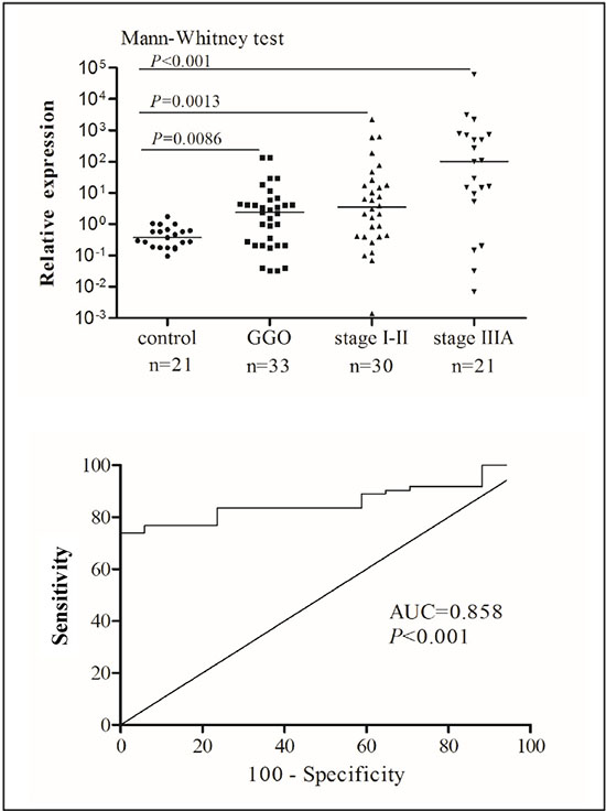 To test whether lncRNA16 is a suitable plasma biomarker, we measured the lncRNA16 levels in the plasma of patients with lung cancer and compared it to those in the plasma of non-cancer participants. The analysis included 33 patients in the GGO group, 30 in the early-stage lung cancer group, and 21 in the advanced stage lung cancer group. As shown in Figure 2A, in each group, the lncRNA16 level was significantly higher in the plasma of patients with lung cancer than in plasma of non-cancer participants.