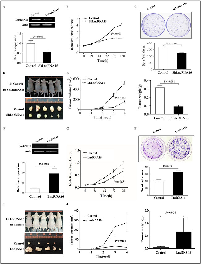 Figure 3: LncRNA16 promotes cell proliferation in vitro and in vivo. (A) RT-PCR and qRT-PCR revealed that lncRNA16 level in PC9-shLncRNA16 cells was reduced compared to that in control (empty vector) cells. (B) MTT assay showed decreased cell proliferation in PC9-shLncRNA16 cells compared to control cells. (C) The ability for colony formation was significantly lower in PC9-shLncRNA16 cells than in control cells. (D) Images of tumors four weeks post injection of PC9-shLncRNA16 and control cells. L, left; R, right. (E) left, tumor volumes at various times points post injection of PC9-shLncRNA16 and control cells. E right, tumor weights noted four weeks post injection of PC9-shLncRNA16 and control cells. (F) RT-PCR and qRT-PCR revealed that lncRNA16 levels in A549-LncRNA16 cells were increased compared to control (empty vector). (G) MTT assay revealed increased cell proliferation in A549-LncRNA16 compared to that in control cells. (H) The ability for colony formation was significantly higher in A549-LncRNA16 cells than in control cells. (I) Images of tumors four weeks post injection of A549-LncRNA16 and control cells. L, left; R, right. (J) left, tumor volumes at various times points post injection of A549-LncRNA16 and control cells. J right, tumor weights noted four weeks post injection of A549-LncRNA16 and control cells.