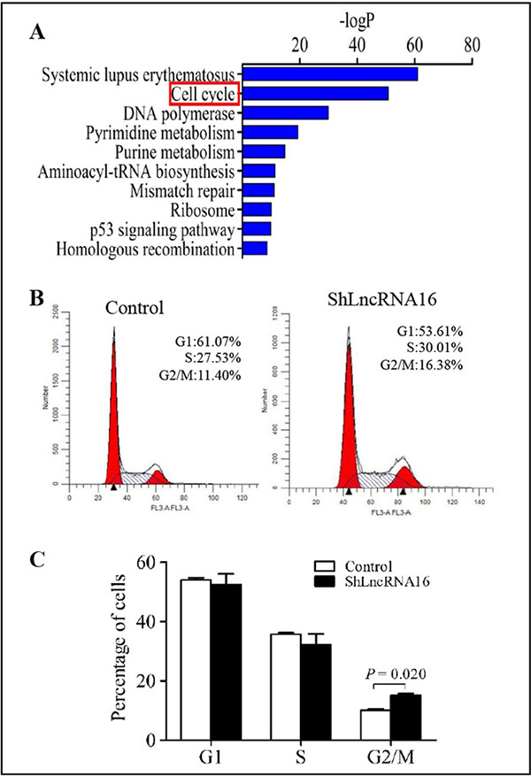 Figure 4: LncRNA16 knockdown in PC9 cells induces G2/M arrest. (A) Pathways associated with lncRNA16 were analyzed using a bioinformatics approach. (B) and (C) Cell cycle analysis of PC9-shLncRNA16 and control cells was performed using flow cytometry. The results are presented as mean ± SD of a triplicate assay.