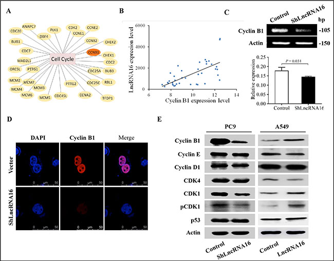 Figure 5: LncRNA16 increases expression of cyclin B1, CDK1 and pCDK1 expression was inhibited at the protein level. (A) mRNA expression profiling revealed differential expression of cell cycle-related mRNAs. (B) Correlation between levels of cyclin B1 mRNA and lncRNA16 in 20 lung cancer tissues and adjacent matched normal tissues, as determined using Spearman correlation analysis. (C) Levels of cyclin B1 mRNA in PC9-shLncRNA16 and control cells were tested using RT-PCR (upper panel) and qRT-PCR (lower panel). (D) Cyclin B1 protein levels and localization in PC9-shLncRNA16 and control cells were analyzed by immunofluorescence assay. (E) Cyclin B1, CDK1 and pCDK1 are determined by Western blotting (WB). E Left, PC9 cells; E right, A549 cell.
