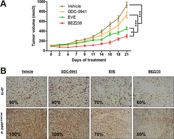 Figure 5: Anti-tumor effect of BEZ235, BKM120 and everolimus (EVE) on human IB136 cell xenografts in Ragγ2C–/– mice. Curves of tumor volume progression during 3 weeks of treatment (A) Mice were randomly assigned to receive 40 mg/kg BEZ235, 50 mg/kg GDC-0941, 5 mg/kg everolimus or vehicle. The data points represent an average from 8 mice (bars, SEM). *p < 0.05; ***p < 0.001, two-way ANOVA. Immunohistochemical staining images of tumor samples treated with anti-p-S6RPser240/244 and anti-Ki-67 antibodies (B).