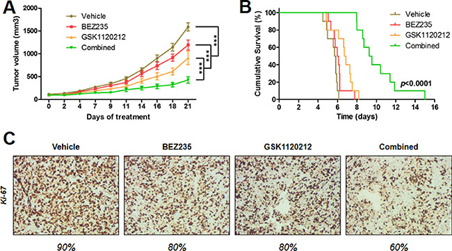 Figure 8: Synergistic anti-tumor effect of the BEZ235 and GSK1120212 combination in human IB136 cell xenografts in Ragγ2C-/- mice. Curves of tumor volume progression during 3 weeks of treatment (A). Mice were randomly treated with vehicle, 10 mg/kg BEZ235, 0.5 mg/kg GSK1120212 or a combination of both drugs. The data points represent an average from 10 mice (bars, SEM). ***p < 0.001, two-way ANOVA. Kaplan-Meier curves for tumor doubling times (B). Immunohistochemical staining images of tumor samples treated with the anti-Ki-67 antibody (C).