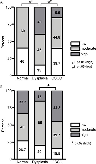 Figure 1: (A) Proportional breakdown of S4S8-RPA phosphorylation groups (low, moderate and high phosphorylation) in cells from normal, dysplasia or OSCC tissues. (B) Proportional breakdown of overall RPA expression levels (low, moderate and high expression) in cells from normal, dysplasia or OSCC tissues.